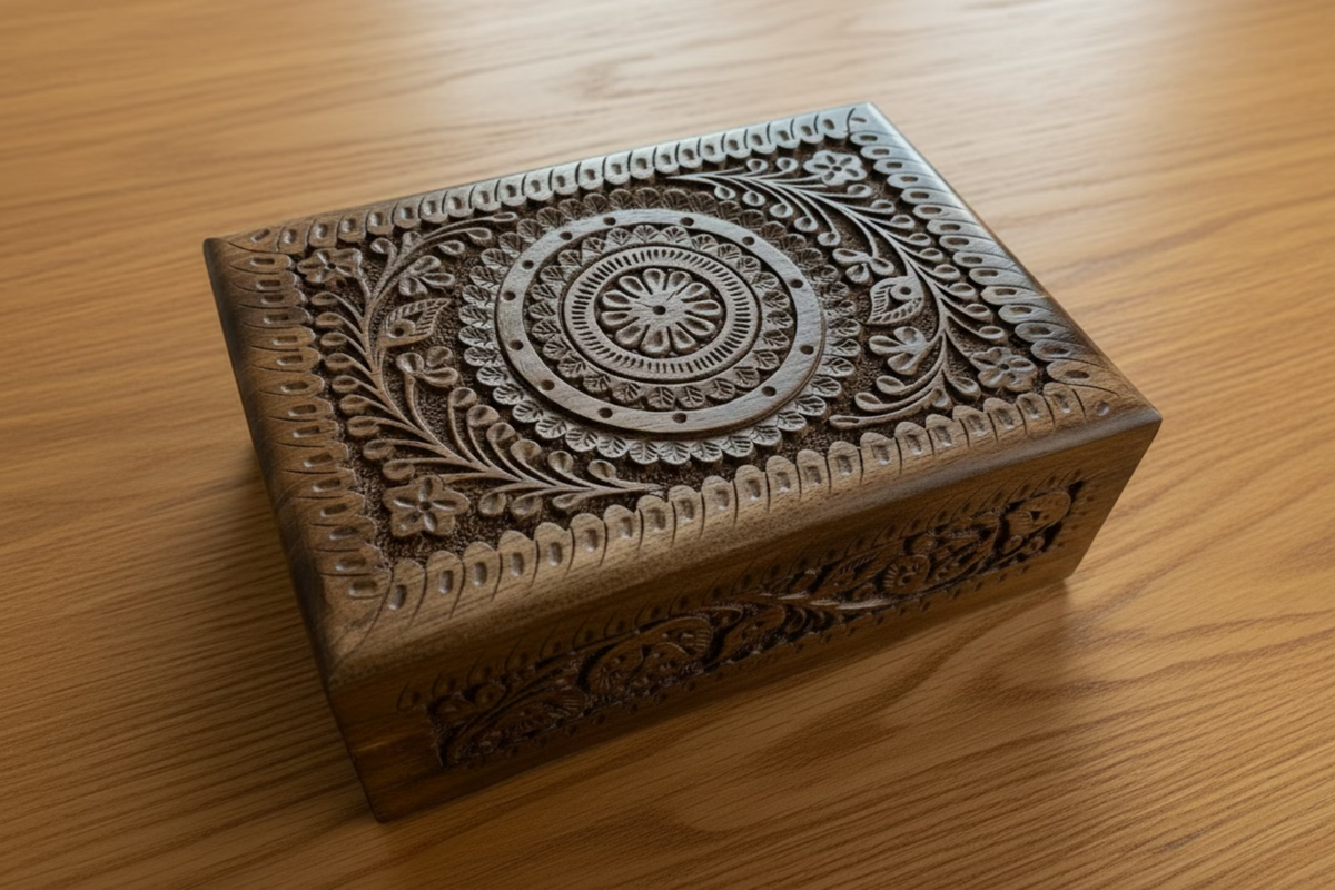 Unlock the beauty and mystery of this hand carved secret lock box,...