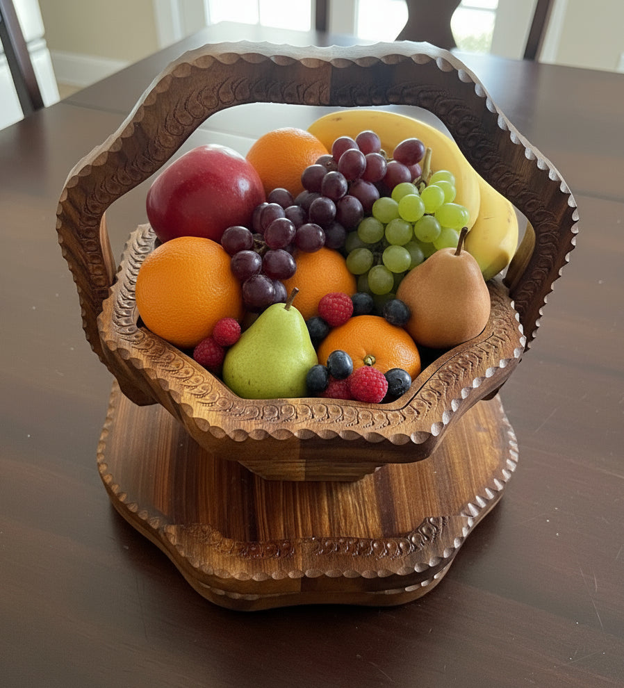 When laid flat the basket serves as a trivet or hot plate, perfect for saving space and easy storage. Simply lift the handle, and it transforms into beautifully finish basket, ideal for holding fruits, nuts, candy or as eye catching centerpiece for your table.