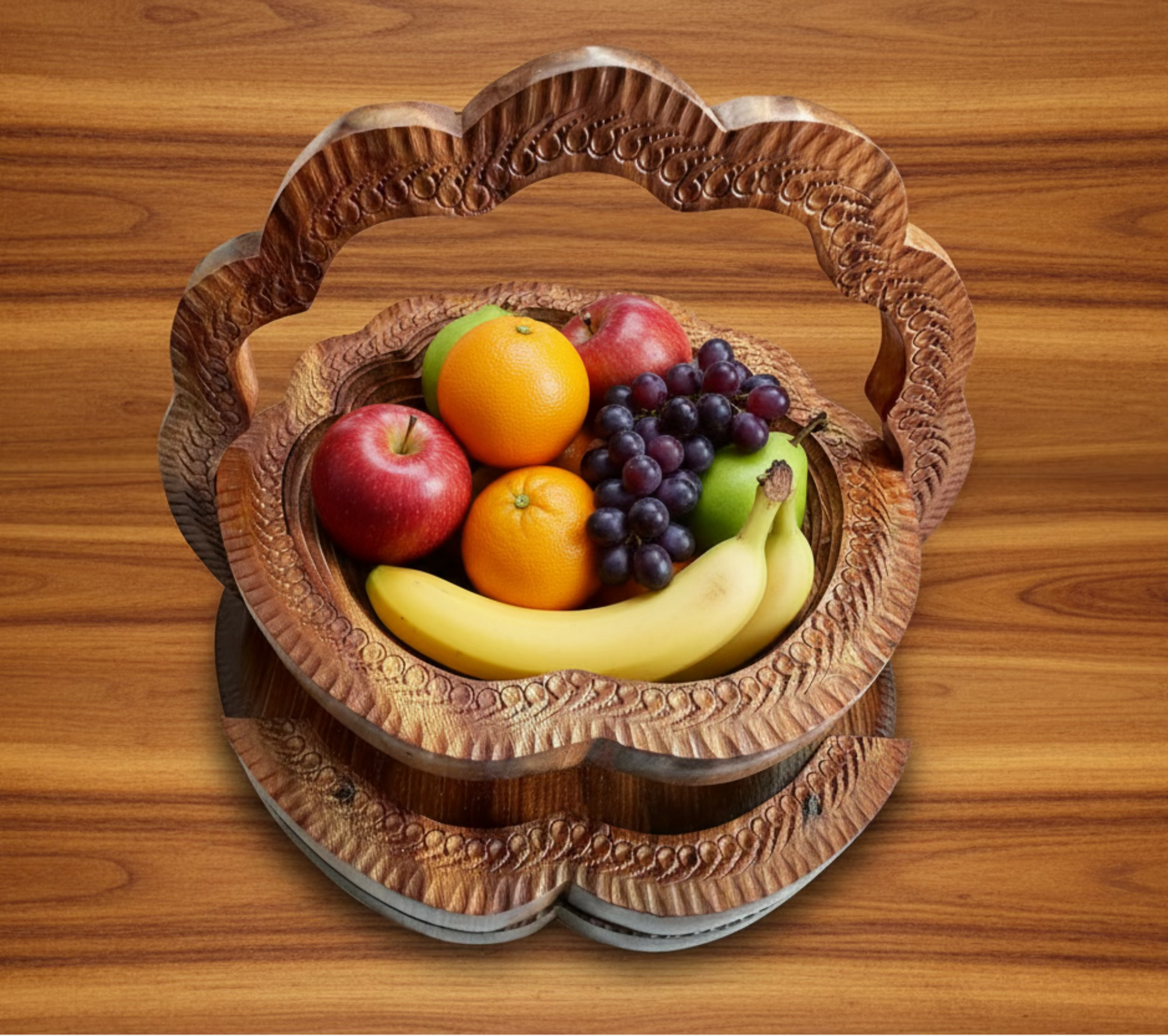 When laid flat the basket serves as a trivet or hot plate, perfect for saving space and easy storage. Simply lift the handle, and it transforms into beautifully finish basket, ideal for holding fruits, nuts, candy or as eye catching centerpiece for your table.