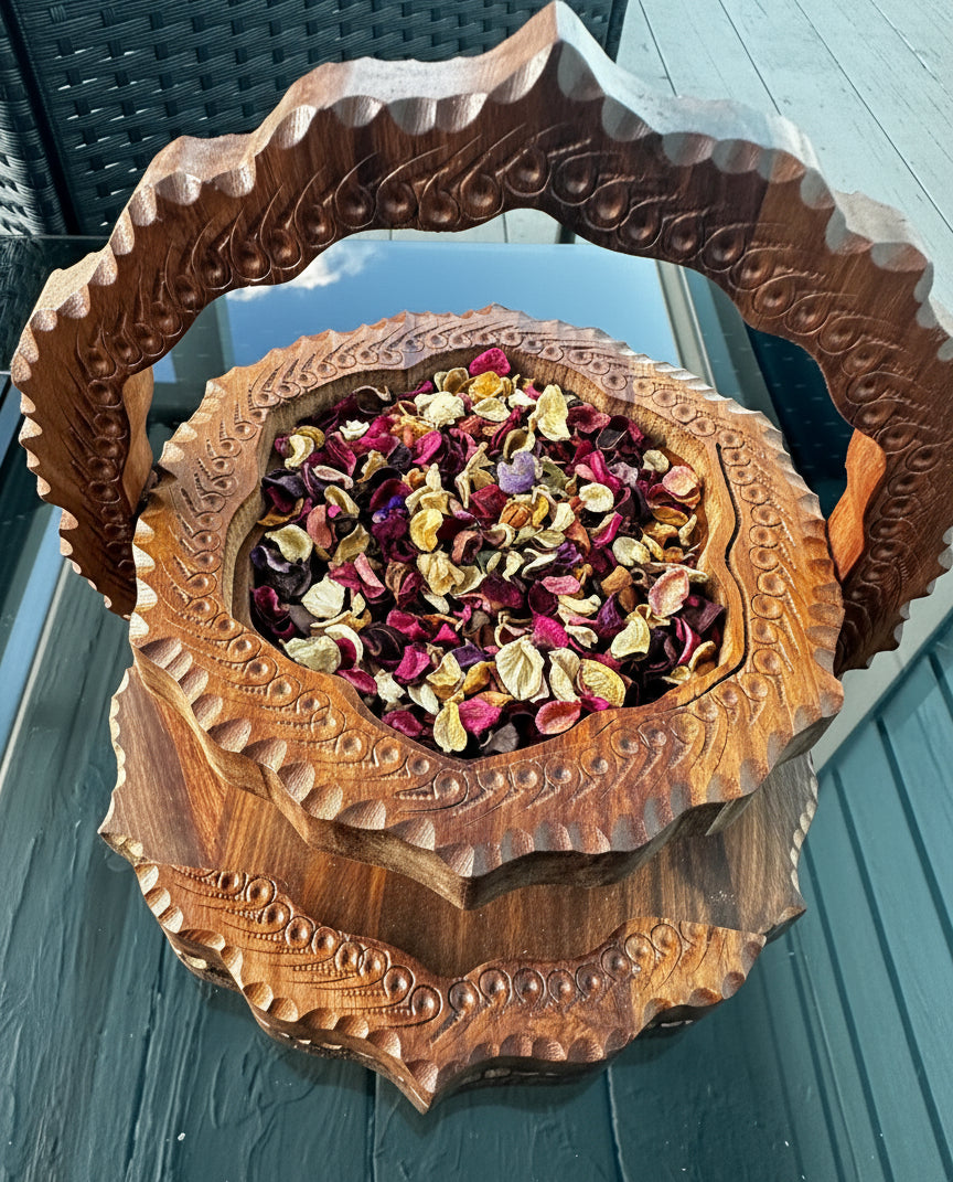 Every basket is crafted from a single piece of Rosewood and showcases hours of detailed carving and fine workmanships.
