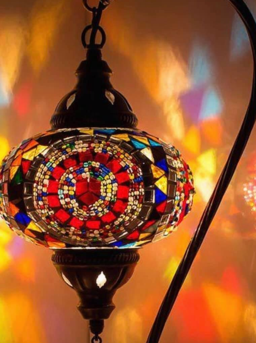 Illuminate your space with the warm, colorful glow of our handmade mosaic lamps, carefully designed with hand cut glasses pieces and vibrant beads, creating stunning patterns that come alive when lit.